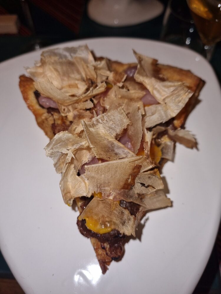 L’abbinamento migliore, anche per la qualità delle proposte enogastronomiche, arriva con la pizza successiva ovvero la Takumi No Umai (Tartare di ricciola, zucca Hokkaido, Katsuobushi, cipolla rossa, Olio EVO) il cui gusto, davvero particolare ed intenso, è supportato alla grande dall’Aranzu (Vermentino 80%, Nuragus e Semidano 20%) della cantina Raica, una piccolissima cantina sarda che ho appena scoperto grazie alla bravura di Chiara.
