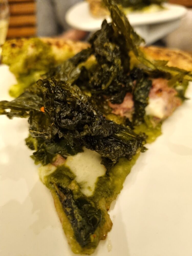 Un’altra pizza strepitosa che mi arriva è la Tre Consistenze di Friarielli (Fiordilatte, provola, salsiccia fresca, crema di friarielli, friarielli spadellati, friarielli croccanti, basilico, Olio EVO) la cui saporosità e persistenza è ben bilanciata dal Franciacorta Pas Dosè di Ca’ dei Ronchi.
