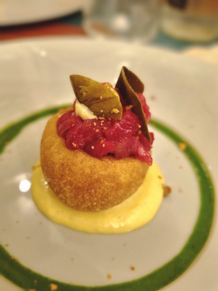 Il mio percorso di degustazione, scelta che consiglio a tutti coloro che vogliono conoscere la vera anima di Avenida Calò, è iniziato con una montanarina con tartare di fassona, maionese salata, nocciole del Piemonte e cicoria selvatica, accompagnato egregiamente da un Crémant d’Alsace Blanc de Blanc di Vincent Stoeffer.
