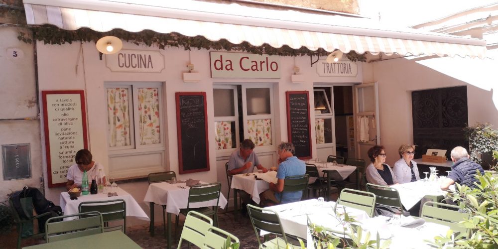 Da Carlo non è proprio nel corso di Orvieto ma in una stradina laterale che “filtra” molto la clientela e ti porta in una piazzetta abbastanza ombreggiata che sembra fatta apposta per mettere dei tavolini all’aperto e mangiare in tranquillità. Naturalmente ci sono anche gli spazi interni, due piccole ma accoglienti salette con dei simpatici e colorati quadri alle pareti.