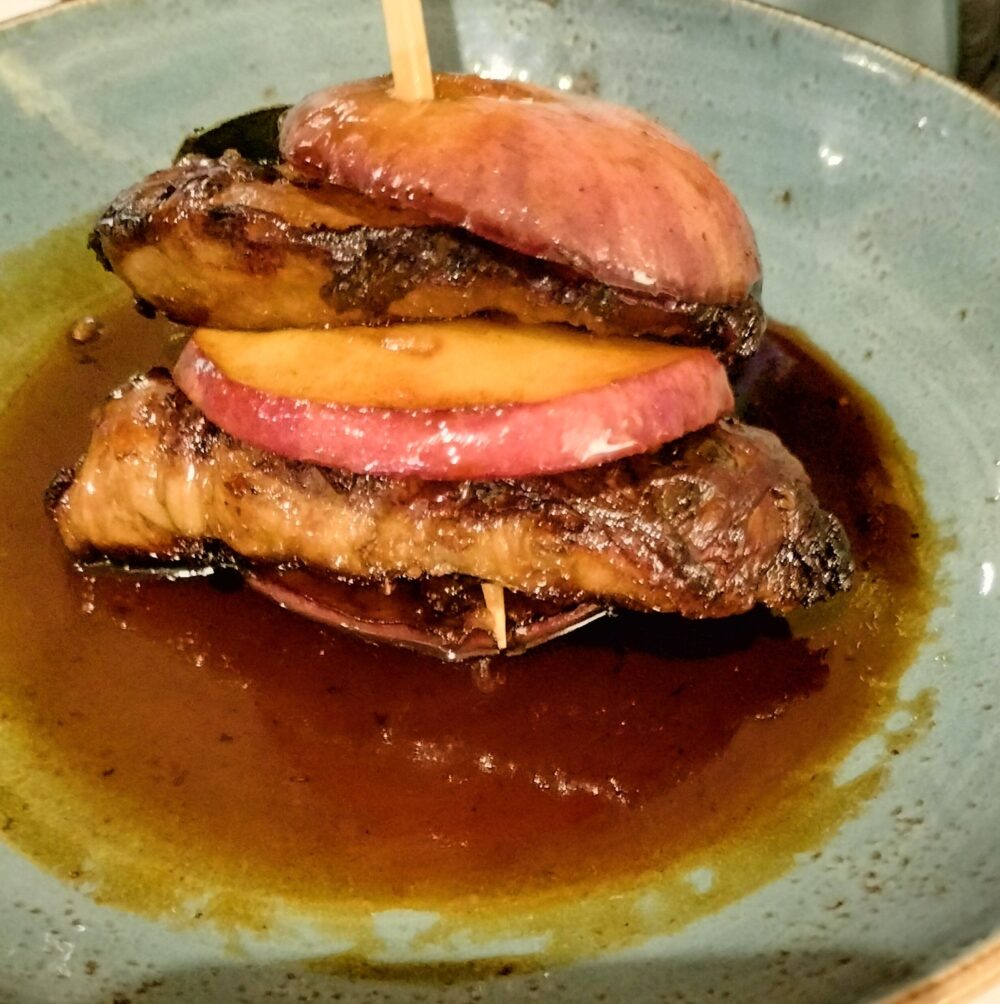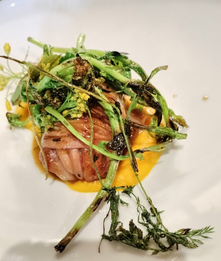 Ma adesso veniamo al sodo, cioè ai piatti che posso consigliare sia perché li ho gustati di persona sia perché ho potuto “annusarli” dagli altri commensali. Tra gli antipasti Inizio con la picagna di angus ciociaro marinata e affumicata al legno di ciliegio, crudo di carciofi e salsa alla senape e miele dove l’affumicatura importante ma equilibrata porta un giusto contrasto alla dolcezza delle carni e con l’abbuoto di abbacchio alla brace (i pugliesi potrebbero chiamarlo gnumarreddi) con carota bruciata e broccoletti scottati, che si scioglie letteralmente in bocca, per arrivare ai sontuosi fegatelli di maiale, mele annurche e mosto cotto di cesanese, piatto strabiliante per equilibrio e pienezza gustativa.