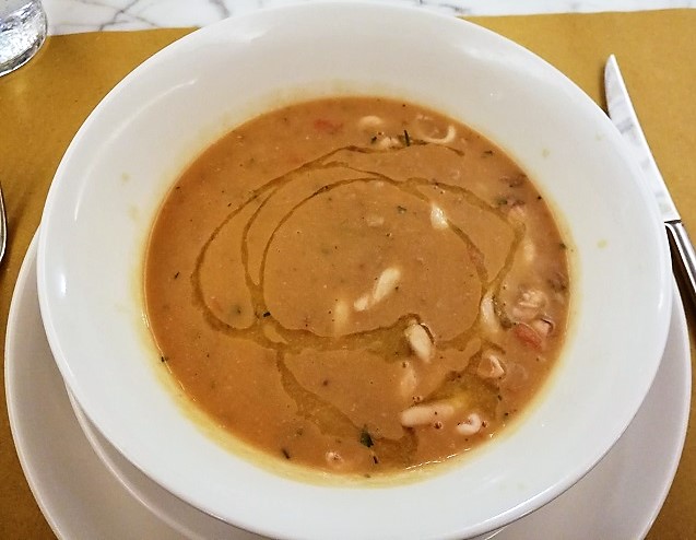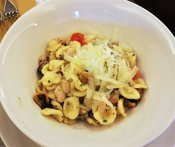 Delicato il Flan di cavolfiore con salsa al gorgonzola che scegliamo tra gli antipasti; proseguiamo poi con i primi piatti, ovvero Orecchiette, cozze, pecorino e cannellini e Zuppa di farro con calamari al rosmarino.