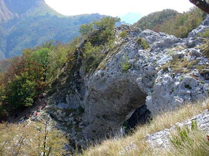 A questo punto avrete camminato circa 2 ore, e sarete a 2/3 del percorso. Nel punto preciso del passo vedrete, alla vostra sinistra, il sentiero 110 che risale la roccia. I primi 3-400 metri sono ripidi, tanto da reggersi in alcuni punti anche con le mani (se avete la mia limitata abilita’) e c’è anche una fune a cui attaccarsi in un punto, ma poi la pendenza si addolcisce ed il sentiero entra nuovamente nel bosco. Dopo quasi un’ora vi troverete davanti una parete di roccia. Guardate meglio, e vi renderete conto che si tratta di un enorme arco.