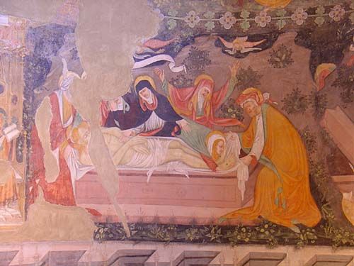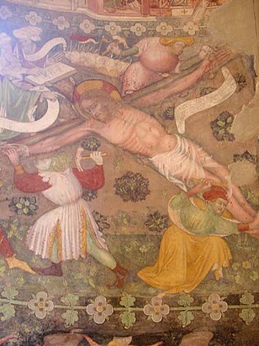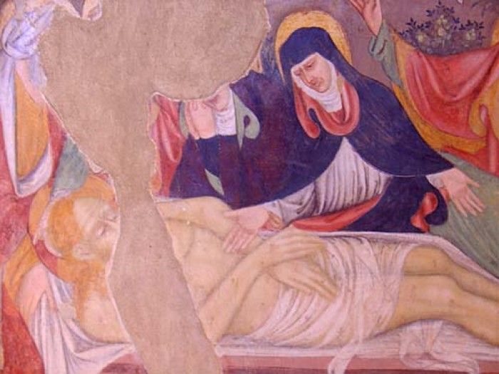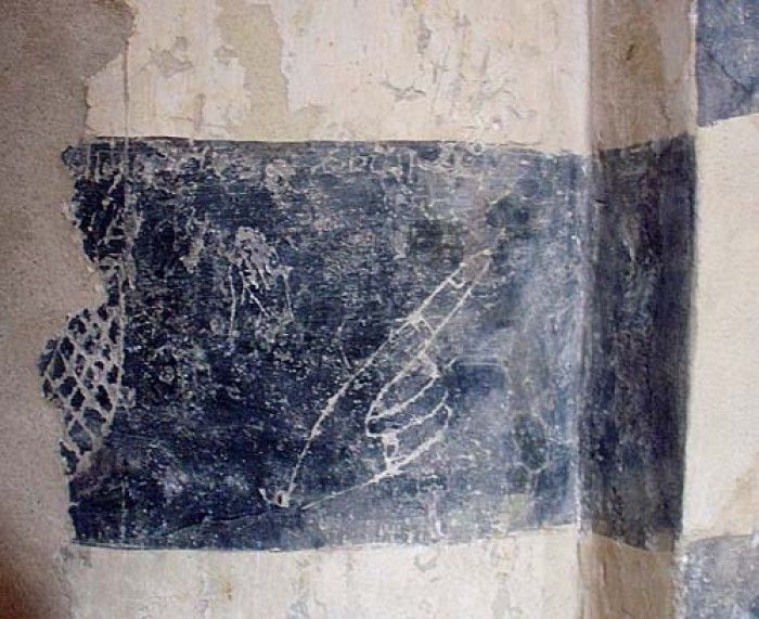 Fu acquistatoa dal Senatore Angelo Frascara nel 1863, e quando questi fece togliere (nel 1912) la calce con cui le pareti erano state imbiancate nel diciassettesimo secolo, scoprì frammenti di una Annunciazione nell’abside sinistro, e un bellissimo ciclo di affreschi Cinquecenteschi raffigurante la Passione di Cristo ed il Giudizio Universale nell’abside centrale. Inoltre, scoprì decorazioni a scacchiera sulle colonne della navata con, in molti dei riquadri neri, graffiti che potrebbero addirittura essere di epoca rinascimentale.