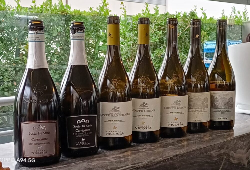I primi due vini che sono stati presentati sono Spumanti Metodo Classico prodotti con uve Carricante, il disciplinare dell’Etna Doc nella tipologia Spumante prevede l’utilizzo esclusivo di Nerello mascalese con il contributo massimo del 20% di altri vitigni a bacca nera, di conseguenza i due suddetti Spumanti escono con la denominazione Doc Sicilia.