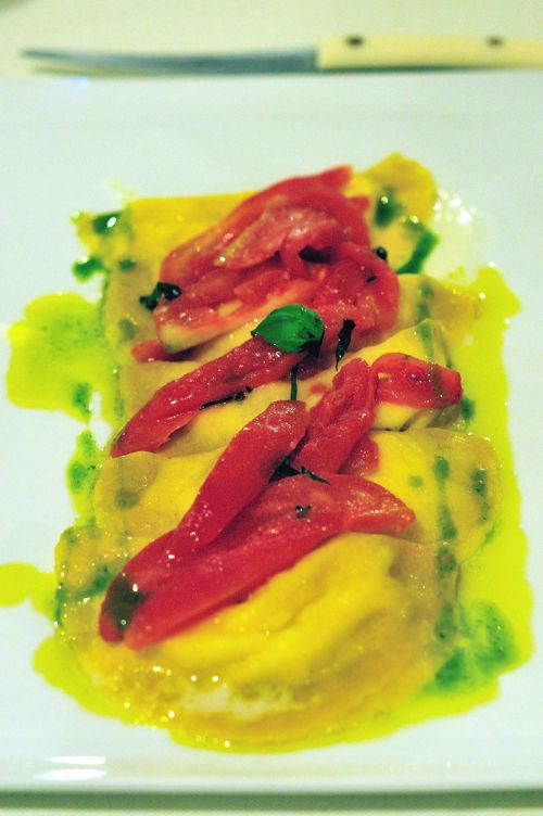Entriamo nel vivo con le “Mezzelune di pasta fresca ripiena di burrata e mozzarella, con filetti di pomodori San Marzano e basilico“: la presentazione potrebbe essere migliorabile, ma in quanto a gusto ci siamo assolutamente, nonostante la presenza della burrata il piatto risulta saporito ma equilibrato e non stanca affatto, anzi.