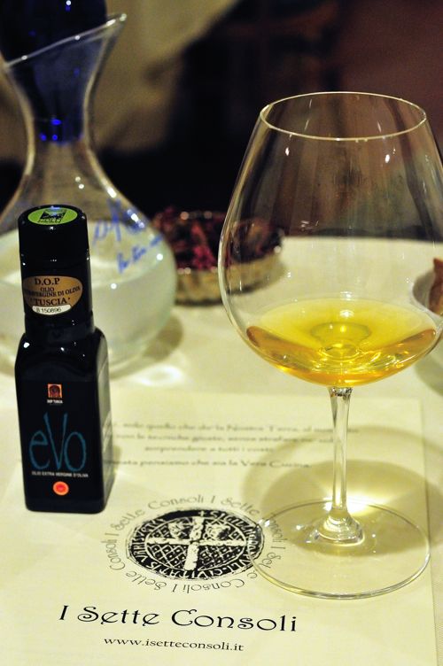 La carta dei vini, infine, prevede un ampio spazio per le cantine umbre, senza per questo trascurare le altre regioni; buona anche la gamma degli Champagne. Ho scelto, pur sapendo che non poteva soddisfare piatti così differenti, un vino a me molto caro, sia perché apprezzo l’azienda che lo produce, sia perché ha davvero caratteristiche a me congeniali: l’Amphora 2006 di Castello di Lispida, un tocai in purezza fermentato con i lieviti propri dell’uva in anfore di terracotta sepolte, con follature giornaliere e nessun controllo della temperatura.