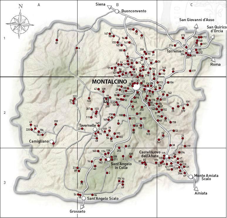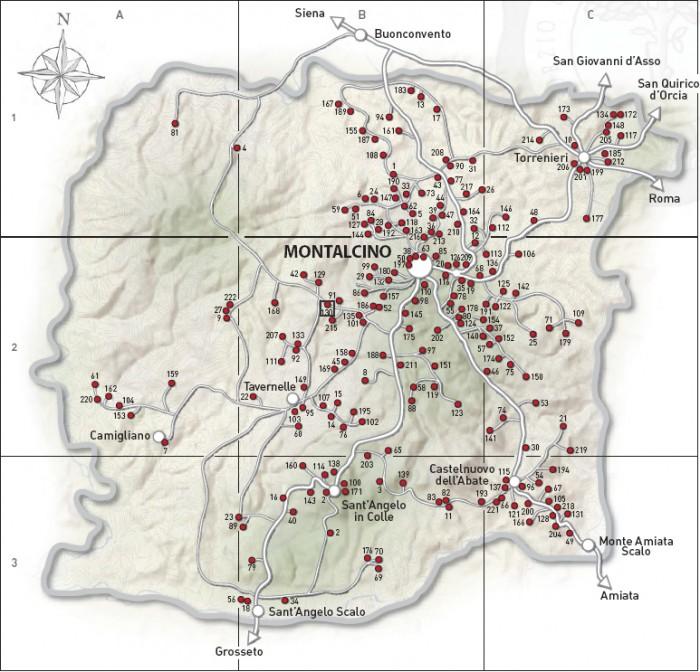 Montalcino deve indubbiamente gran parte della sua notorietà alla tradizione vitivinicola, che trova nel Brunello uno dei grandi simboli del vino italiano. Oggi vanta un patrimonio vitato di 3.500 ettari totali (su una superficie comunale di 24.000 ettari), di cui 2.100 a Docg Brunello di Montalcino e 510 destinati al Doc Rosso di Montalcino, con un numero di produttori associati in consorzio di ben 250 (di cui 208 produttori imbottigliatori). Va detto che di quei 3.500 ettari una grossa fetta si trova nei terreni di Castello Banfi (850) e un’altra quota importante è ripartita fra pochi “colossi”.