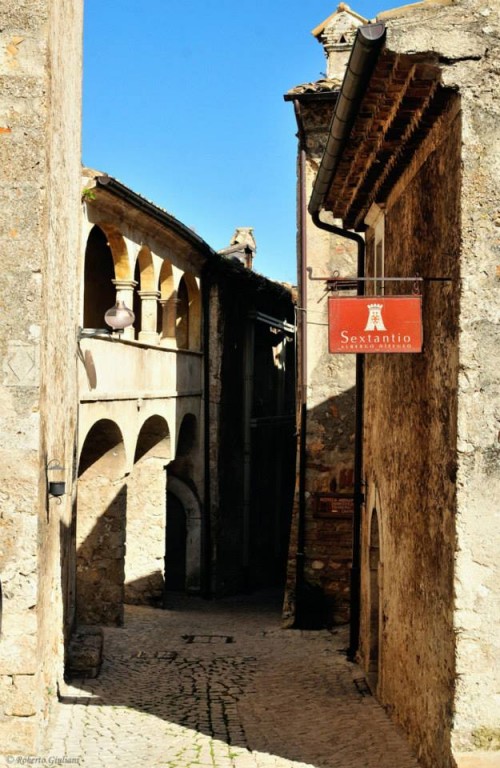 La sensazione che abbiamo avuto sin dal primo impatto visivo è stata di un luogo dove regna la pace in un paesaggio mozzafiato. Per i più curiosi, ci sono tre ipotesi sul termine “Sessanio”, la più accreditata è che potrebbe essere una corruzione di Sextantio (non a caso nel borgo c’è un albergo che prende questo nome), dall’antico toponimo del primo insediamento romano, che sorgeva a 6 miglia dal centro abitato più vicino, Peltuinum, sull’altopiano di Navelli dove cresce lo zafferano. La seconda ipotesi vede in “sessanio” una corrispondenza con “des six ans”, ovvero dei sei anni, la condanna che un tempo si dava ai ladri che venivano incarcerati nella rocca del paese. L’ultima è che il nome deriverebbe da “six anni”, anche in questo caso riferito a una condanna che veniva inflitta durante l’impero romano.