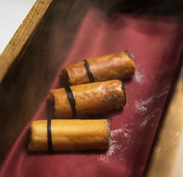 Il meglio, però è venuto alla fine, quando dopo il lauto pasto si apre la fase del fumo: serviti in una scatola di legno da sigari, bella annerita e odorosa, appunto, di fumo, ecco in effetti dei sigari. Cenere compresa. Da mangiare, però. E in tutto – tatto, aspetto, consistenza, profumo e perfino sapore – stupefacentemente identici ai sigari veri.