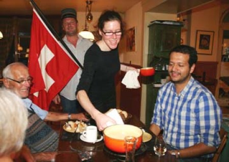 Intanto sul tavolo accanto al mio, in un tintinnare di calici di Chasselas, il tipico bianco locale, planano vassoi di affettati e soprattutto il pentolino fumante della fonduta alla vaudonnaise, quella fatta fatta con metà Gruyère e metà Vacherin Fribourgeois. Poi pane, forchettoni e via con l’inzuppo.
