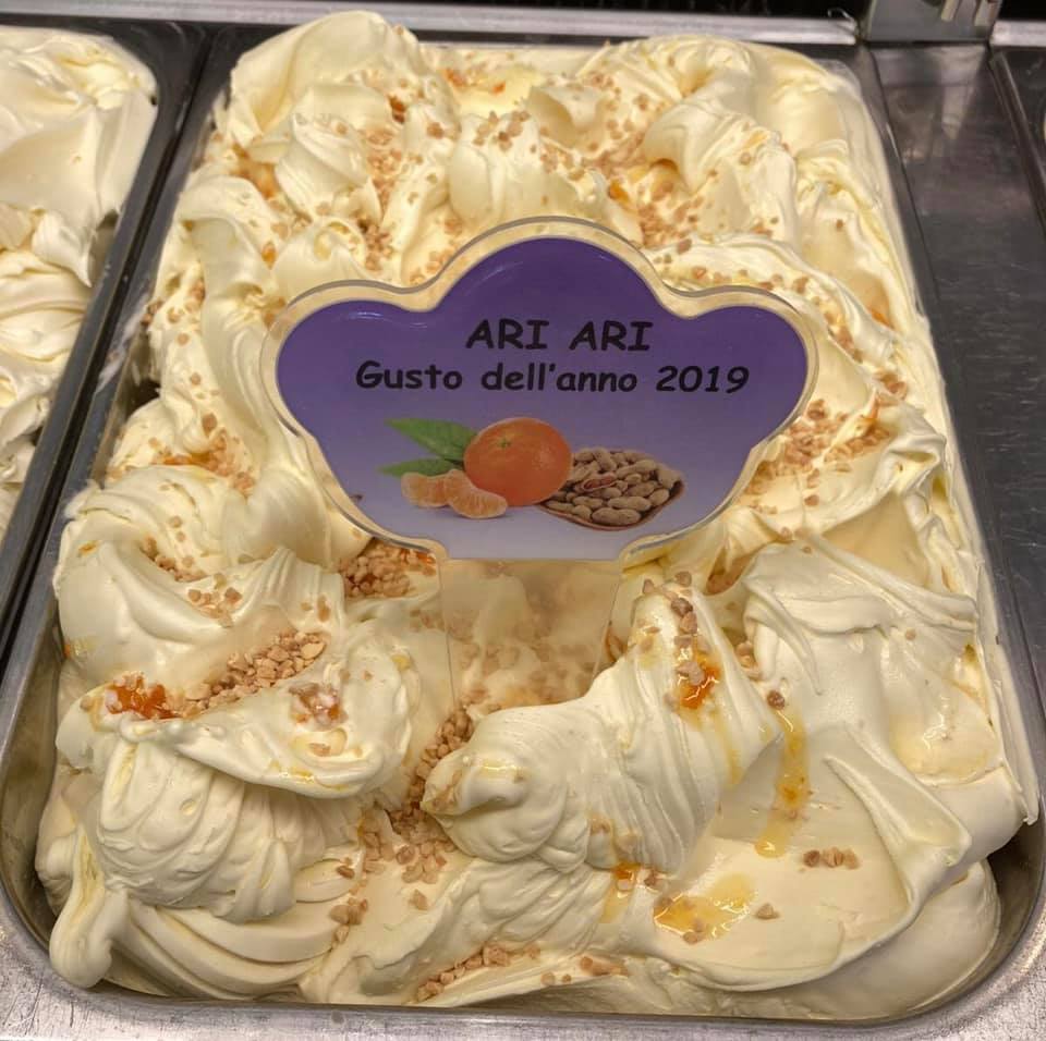Oggi nella sua frigovetrina che cura personalmente ogni giorno, si trovano sempre i gusti classici e non più di due creazioni gourmet che seguono il ritmo delle stagioni ed esprimono la stessa golosità di un piatto d’autore. Come per l’Ari Ari: base crema profumata con liquore del Gran Pastore, aromatizzata con scorze di arancia e limone canditi, variegata con salsa d’arancia e mandarino e rifinita con arachidi caramellate dolci e salate.