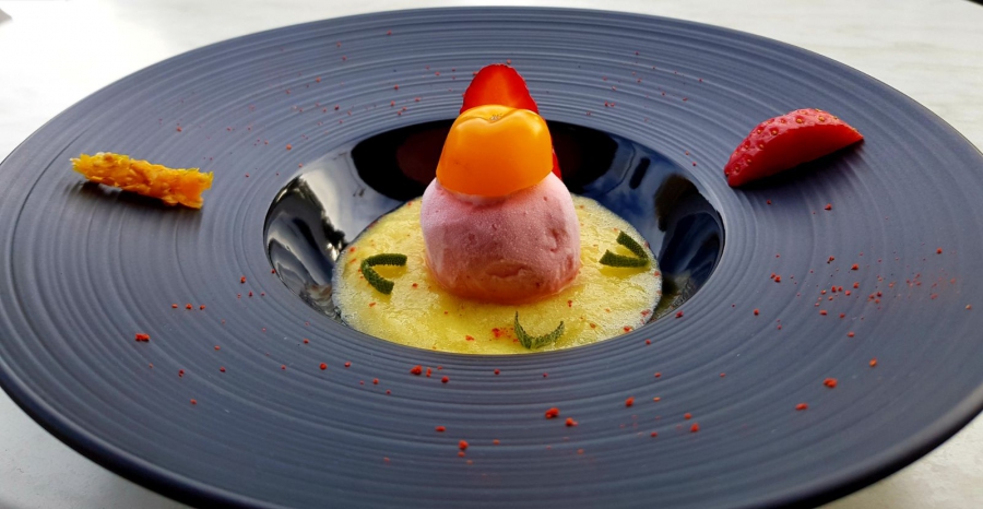 Preparare uno sciroppo con acqua e saccarosio neutri. Aggiungere i pomodori (dopo aver tolto i semini), l'olio evo e le fragole. Frullare tutto far riposare la miscela e mantecare. Impiattare la passata di pomodorini gialli, il gelato pomodorini gialli e fragola, aggiungere le erbe, per una ricetta in cui c'è il dolce, il salato, l'acidità. Decorare con pomodorini gialli e fragole candite, sale maldon o nero di Cipro e per finire sopra si mette l'olio evo.
