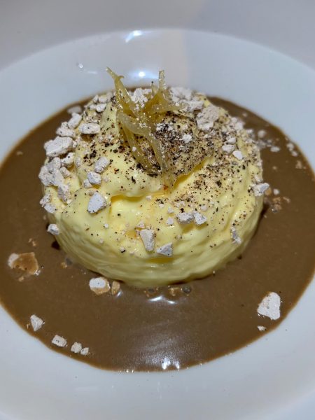Sui dolci di nuovo colpi a sorpresa, con il cannolo agli spinaci e con la mousse al limone, su tartellette di biscotto e crema di caffè. A primo impatto la freschezza del limone poi la croccantezza del biscotto e la scioglievolezza delle meringhe. Infine resta questo sapore persistente di caffè che fa concludere degnamente il pasto. In fin dei conti tutti noi amiamo chiudere con un caffè oppure con il gusto del limone. Qui lo chef ci toglie dall’imbarazzo della scelta e ci serve i consueti gusti del fine pasto in un dessert ottimamente eseguito.