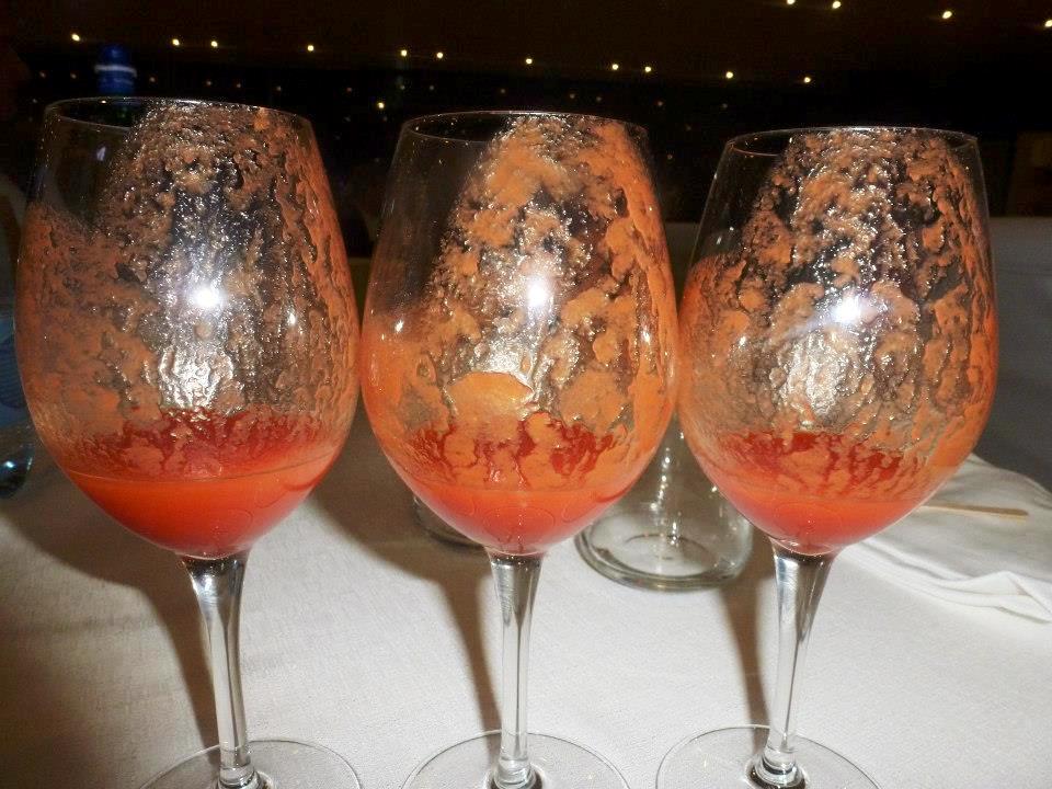 Esaurito il tema mozzarella, compaiono sui tavoli tre calici da vino… mistero, si parla di pomodoro a che servono i calici? L’arcano è subito svelato da Gennaro: “ vi presento stasera tre San Marzano eccellenti, tutti prodotti nell’area del disciplinare, per imparare a distinguerne la qualità nel modo più spietato, cioè con l’esame organolettico, esattamente come si fa per il vino e per me, non c’è differenza di valore.