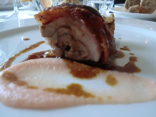 Inizia la batteria delle carni come mai avevamo fatto. Le voglio provare tutte. Il maialino, un animale che non amo particolarmente come secondo, è trattato con un pelo e contropelo di freschezza. Anche in questo caso il cuoco si preoccupa che la carne dolce possa stancare, asseconda questa tendenza invece di ostacolarla ma nel contenpo aggiunge la freschezza delle albicocche e delle mele.