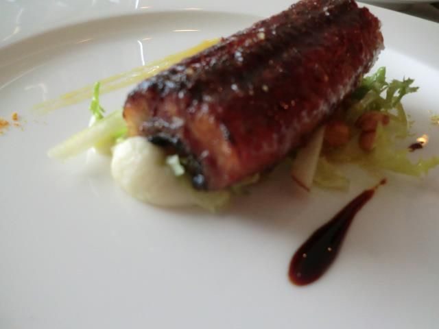L’anguilla non è nuovissimo come piatto, nel senso che è uscito in fine stagione 2011. Un bell’agro-dolce in cui il miele è integrato senza strafare. La soluzione di usare il miele con questo pesce l’abbiamo trovata, in altra versione, alla Trota di Rivodutri tra i nuovi piatti. Qui è meno vegetale, più votata alla freschezza.