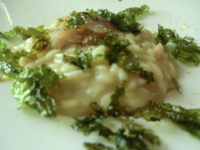 Risotto con cipolla ramata di Montoro, sauro bianco affumicato, alga croccante al profumo di limone e peperoncino