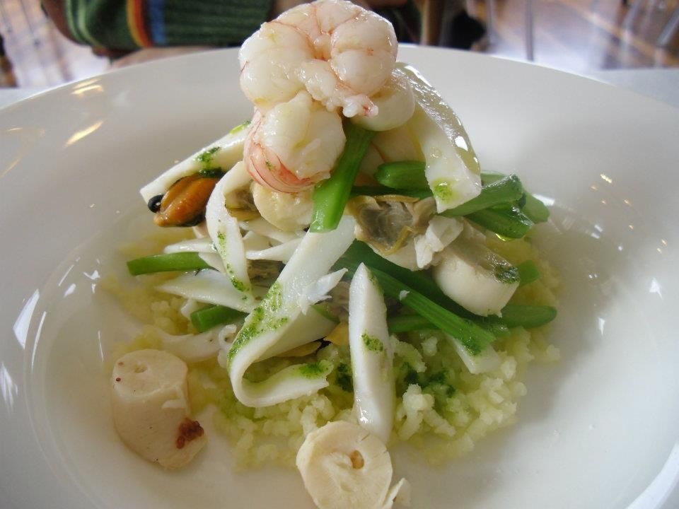 Tra le altre proposte: una selezione di crudo del Mar Ligure, a seconda del mercato; peperone arrosto ripieno di tonno e acciughe di Camogli; tortina di acciughe fresche, taccole e composta di cipolla rossa genovese; cappesante alla plancia, salsa di bietole ed erbe, pancetta croccante e prugne secche; gnocchetti di zucca ligure su bisque di crostacei, pasta di Gragnano artigianale, cozze, cime di rapa e ricotta carnica affumicata; gnocchetti di ricotta fresca fatti a mano, seppia di Nassa e pomodorini semi secchi; ravioli con ripieno di pesto liquido su patate viola; calamaro fresco ripieno, scarola stufata e uvetta; trancio di salmone biologico marinato all’aneto scottato e affumicato al momento su passata di piselli; variazione di baccalà “Gadus Morhua”; pescato del giorno in guazzetto con frutti di mare e pane croccante; fritto di paranza e verdure in pastella.