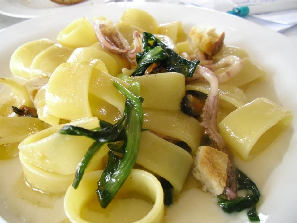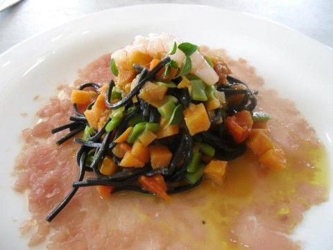 Fuori menu proviamo una pasta e fagioli con cozze fatta con la pasta artigianale di Gragnano, cozze molto saporite, calamari, qualche foglia di rapa e una crema di fagioli. Buona, ma senza grosso mordente, mentre l’altro primo piatto, i tagliolini al nero di seppia con verdure fresche su schiacciata di palamita pescata risulterà piuttosto slegato.