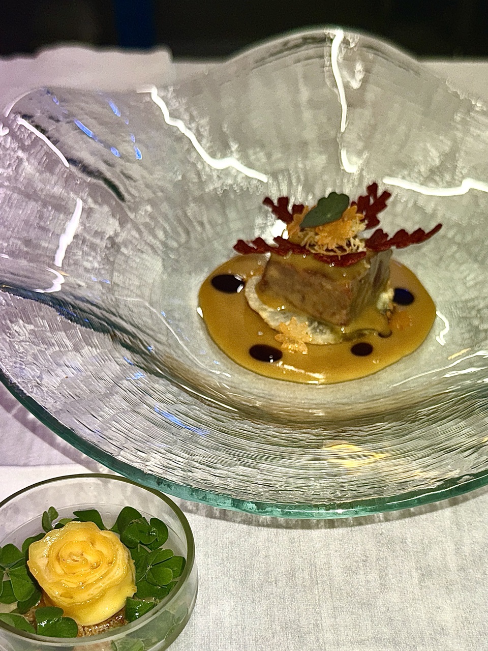 Sul fondo di un altro piatto, disporre le foglie di acetosella, quindi distribuire sopra la cipolla croccante. Aggiungere la marmellata di mandarino e completare con la pappardella di pasta ripiena. Prima di servire, versarvi sopra il brodo chiarificato.