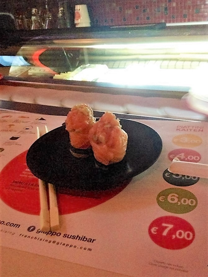 L’ ambiente di Giappo è sicuramente giovane e alla mano. Mangiare prendendo direttamente le pietanze dal nastro trasportatore è un’ esperienza divertente e sicuramente da provare, anche se l’ ambiente è un pò troppo scuro per i miei gusti e a cagione di ciò si perde il contatto visivo con il cibo, che di una degustazione è una componente imprescindibile. Il sushi ovviamente è caratterizzato da una commistione di influenze nipponiche e sud americane e sicuramente la componente del rullo, spesso non giova alla freschezza delle pietanze, le quali vengono conservate coperte da una sorta di cupoletta di plastica. Al diverso colore dei piattini corrisponde una diversa qualità del prodotto ed ovviamente un diverso prezzo. Ciò contribuisce a rendere la degustazione un pò più divertente e sicuramente ad avere un attenzione in più alla spesa, tenendola sotto controllo “cromaticamente”.
