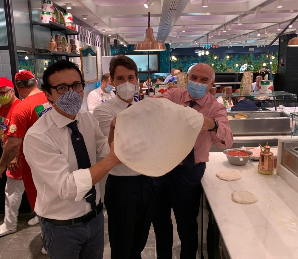 Venerdì 18 settembre, presso la sede di Gino Sorbillo Gourmand – al sesto piano dello stabile di Via del Tritone – Maurizio Marinella ha consegnato una cravatta speciale realizzata in seta blu ricamata con i colori della bandiera italiana. Sorbillo e Marinella, poi, hanno preparato delle speciali “pizze con la cravatta” per suggellare il momento.