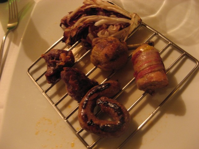 Poi raviolo di farina di Grassetto (integrale) ripieno di melanzane su fonduta di cacioricotta e conserva di pomodoro. Tra i secondi ottimo l’arrosticino di carni locali, sempre in carta per assecondare la passione dei pugliesi di questo territorio per la carne cotta velocemente alla brace, sono numerose infatti le macellerie dotate di brace e tavoli dove viene servita la carne scelta al banco: zampina (salsiccia di carni miste), involtini di carne di cavallo, aletta di pollo ruspante ripiena, porchetta di pollo.
