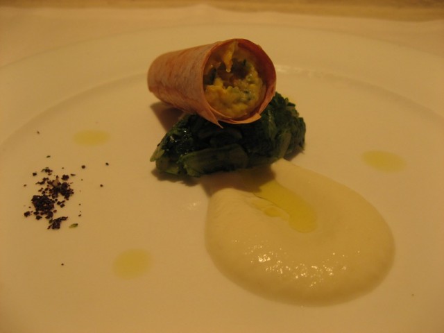 Tra gli antipasti: cannolo di verdurine su stufatino di bietole, crema di cavolfiore e polvere di peperoni cruschi di Senise, a conferma della passione di Ottavio per le verdure, ottimo.