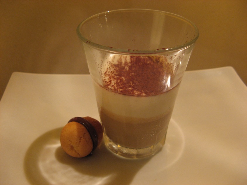 A seguire i dessert nei quali Ottavio ha dato grande prova di bravura: sorbetto di anguria e vaniglia su coulis di pesche noci; cappuccino freddo (crema inglese al caffè e panna alla vaniglia con bacio di dama ); semifreddo alla mandorla con gelato al primitivo di Gioia del Colle e biscotto di riso al cioccolato; crema al mascarpone con savoiardi al caffè.