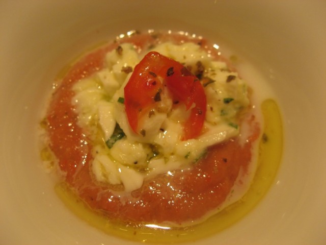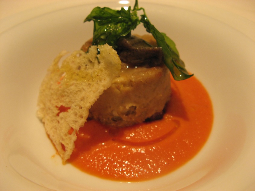 Sempre rimanendo nell’orto di Gioia: flan di melanzane e mozzarella su pomodoro aromatico e basilico fritto, ovviamente anche la mozzarella è di Gioia del Colle, famosa per la produzione di latticini tipici.