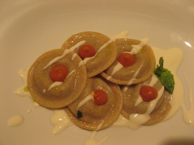 Raviolo di grossetto ripieno di melanzana su fonduta di cacioricotta e conserva di pomodoro