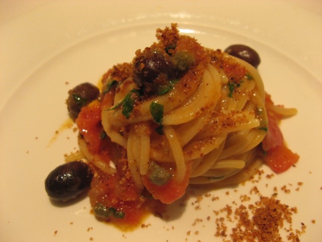 Proseguiamo con i primi e si comincia con il piatto che in zona un po’ identifica Ottavio, sempre presente in carta perché richiestissimo, piatto della memoria familiare che conferma come l’estrema semplicità in cucina riscontri sempre grande successo: La Poveraccia, ovvero spaghettone trafilato al bronzo del pastificio artigianale Marella (di Gioia), con olive nere, pomodoro, capperi, acciughe e mollica di pane fritta, una delizia.