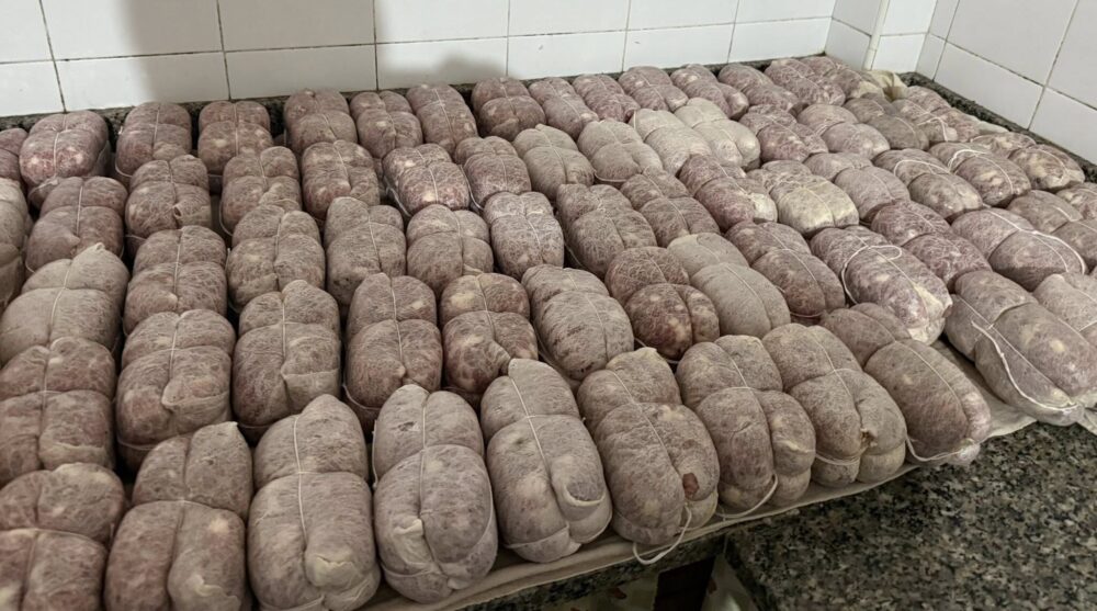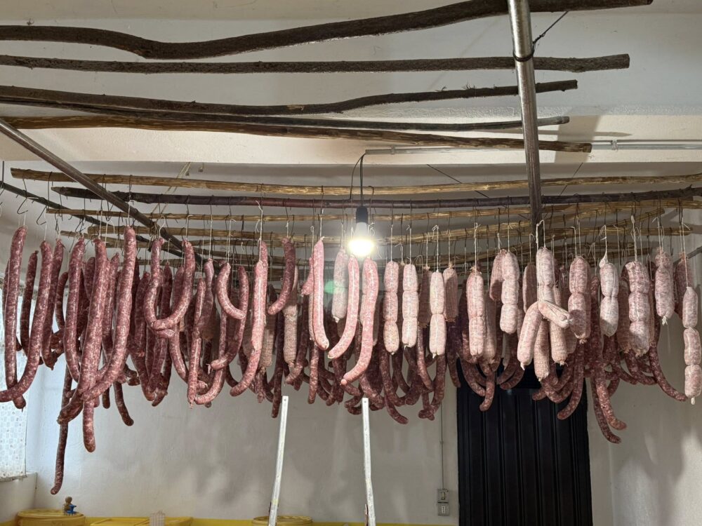 Si trita, si insacca, si lega. Tutto a mano. Carne scelta di lombo e di coscia, zero conservanti, asciugatura alla pertica, altro che celle. Poi sotto olio o sotto sugna. Ricordatevelo quando direte che costa troppo, abituati a salumi di supermercato, stagionati poco e male e preparati con carni estere.