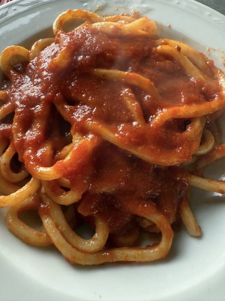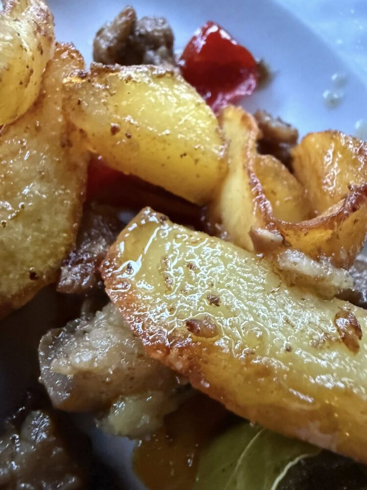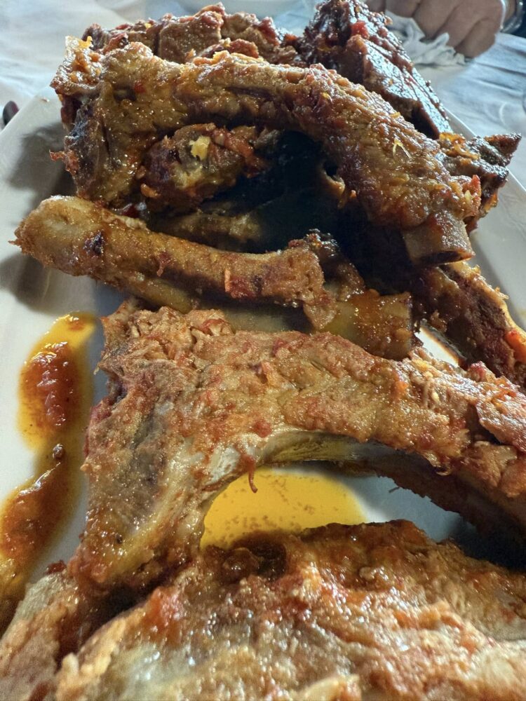 La maccaronara, verrà impreziosita da un sugo di tracchie, reso buonissimo, dalla carne ma soprattutto dai pomodori. Parliamo di bottiglie fatte in casa, con pomodori del loro orto. Poi, i miei 3 piatti del viaggio, il primo, le ossa al sugo, ossia tutto ciò che rimane dopo il prelievo dei tagli anatomici principali per realizzare i salumi. Sono di un buono che non vi so spiegare, da mangiare rigorosamente con le mani e “spuzzuliare” avidamente. Poi la sfrionzola, patate, peperoni sotto aceto e maiale.