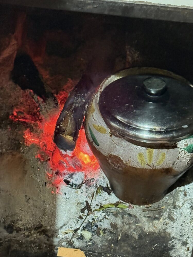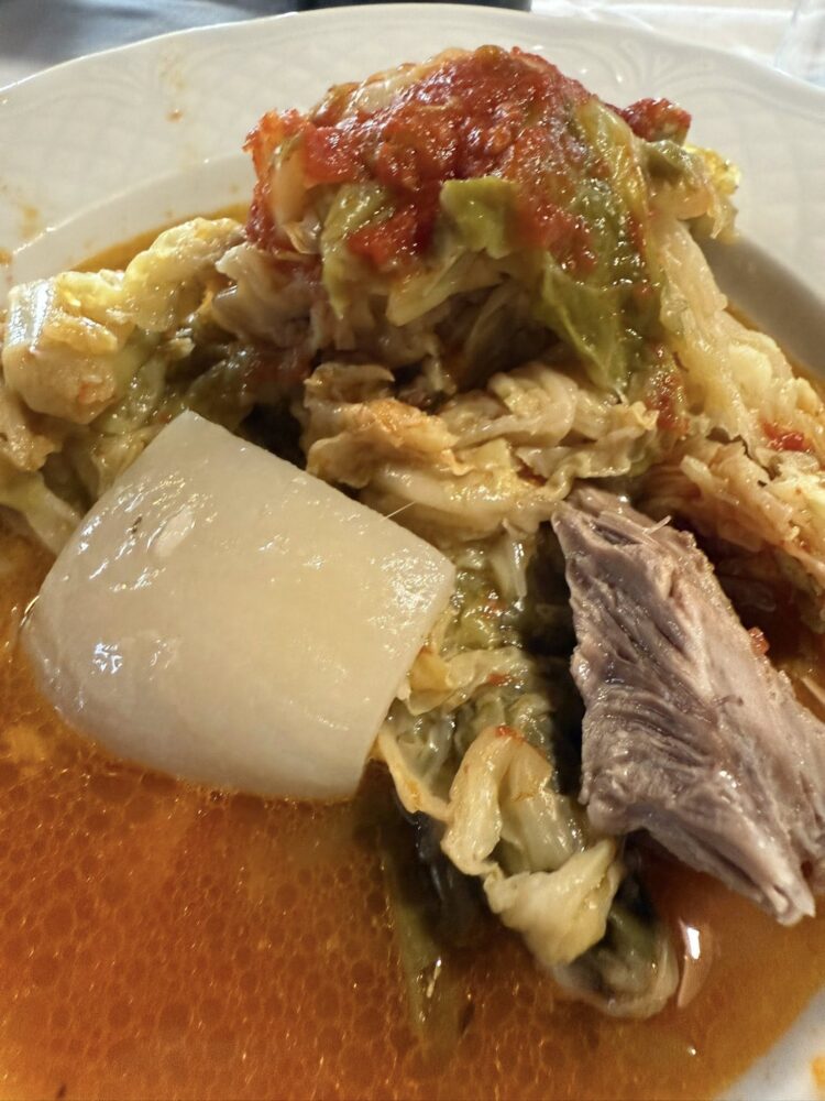 La verdura cuoce nell’orcio di terracotta nel camino, cucina primordiale, lenta, terra e fuoco. Finirà nei piatti accompagnata dalla carne di testa e dalle cotiche.