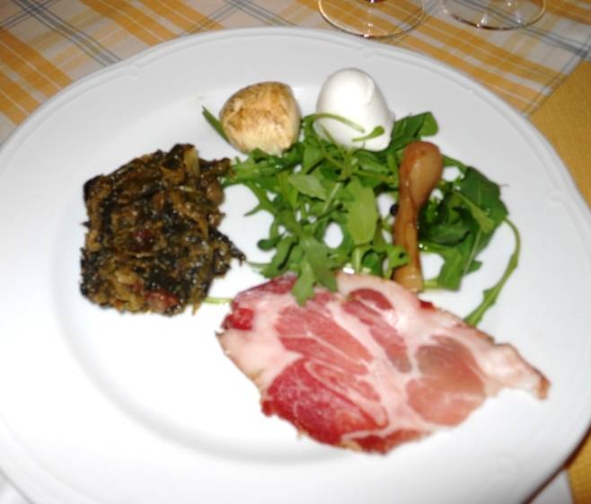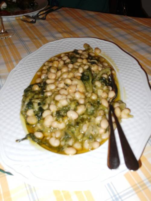 Abbiamo cominciato con prelibati assaggi di antipasti misti: scarole con olive, capperi uvetta e pinoli; scarola e fagioli; ciliegine di mozzarella bianche ed affumicate; cipollotti arrostiti e affettati misti. In abbinamento all’Aglianico Ascolto 2010 della Masseria La Morella, di proprietà del nostro anfitrione, nonché pivot Fabio Miletto (è alto almeno due metri!).