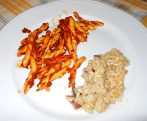 Poi due primi: risotto con radicchio e salsiccia; e fusilli al ragù, con accompagnamento del Ragis 2009 dell’azienda Le Vigne di Raito, un blend di Aglianico e saldo di Piedirosso.
