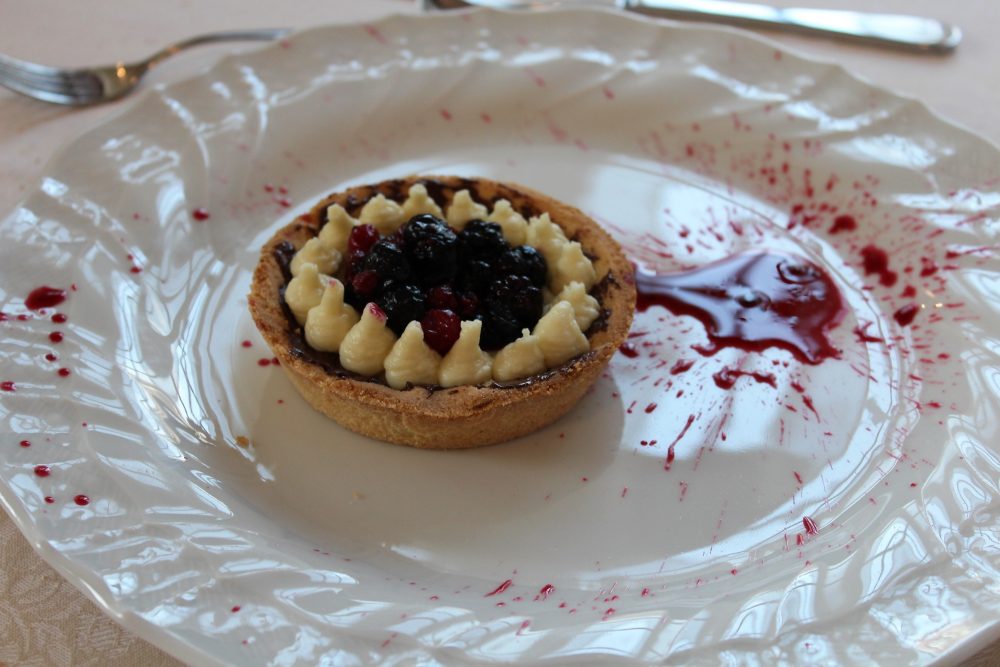 Giulio Restaurant dessert – tortina al cioccolato bianco e fondente, frutti rossi