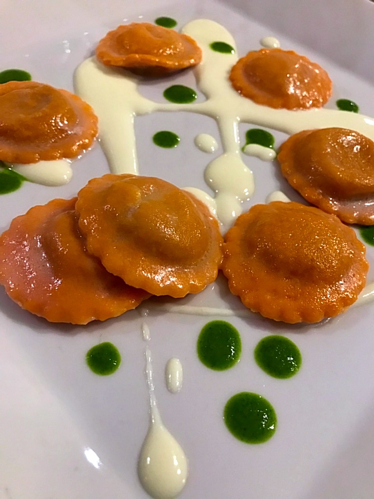 Giulio Restaurant – Ravioli artigianali al rosso di pomodoro San Marzano con patè di melanzane e dragoncello, su fondo di pecorino e salsa di basilico