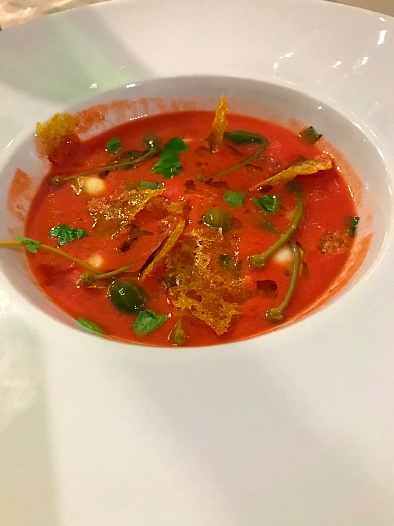 Giulio Restaurant – Zuppetta di datterini gialli e rossi, fior di latte di Agerola, frutto di cappero e cialda di mais