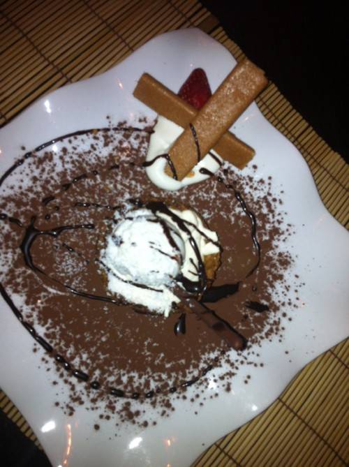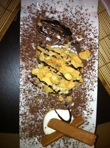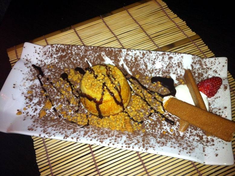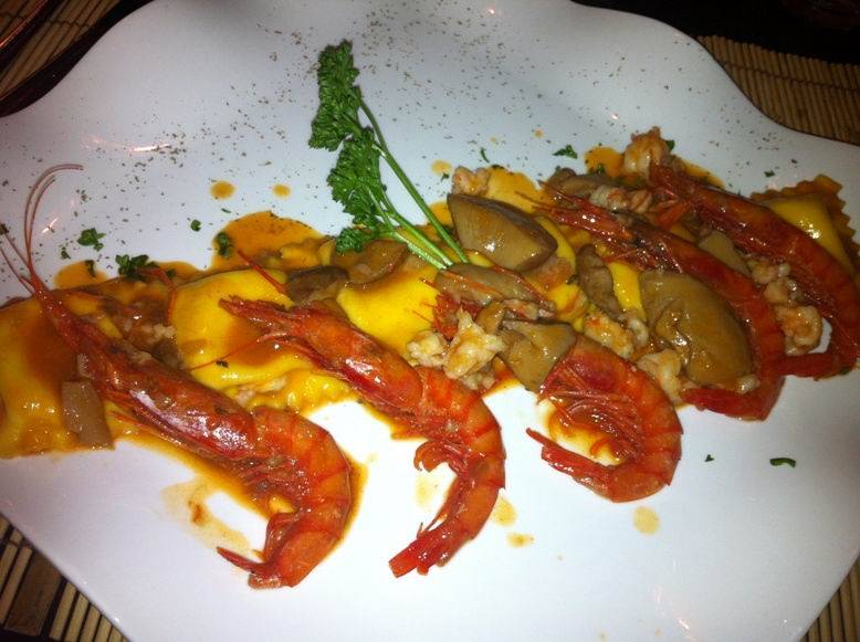 Ma passiamo al dunque. Oltre alle tipiche portate giapponesi, sushi incluso, che in cucina garantiscono pesce sempre fresco, Giuseppe Di Natale si diverte ai fornelli con prodotti di tutta Italia e, con il suo aiuto sardo, aggiunge sempre un tocco personale. Lo dimostrano i piatti preparati a cena. Si inizia con un antipasto Fantasia di mare: Carpaccio di tonno affumicato con glassa di aceto balsamico e nocciole; polpo ai ferri con una leggerissima purea di patate ed erba cipollina, salmone marinato al limone, vellutata di carciofi con tartare di seppie: Squisito! Oltre alla bontà dei prodotti sono giustissimi gli accoppiamenti di sapori, tutti in grande equilibrio. Poi si continua con un primo piatto: ravioli di burrata con crema di funghi porcini e gamberi rossi di Sicilia. Originale oltre che delizioso, con un ripieno cremoso, molto diverso della ricotta a cui siamo abituati in Campania.