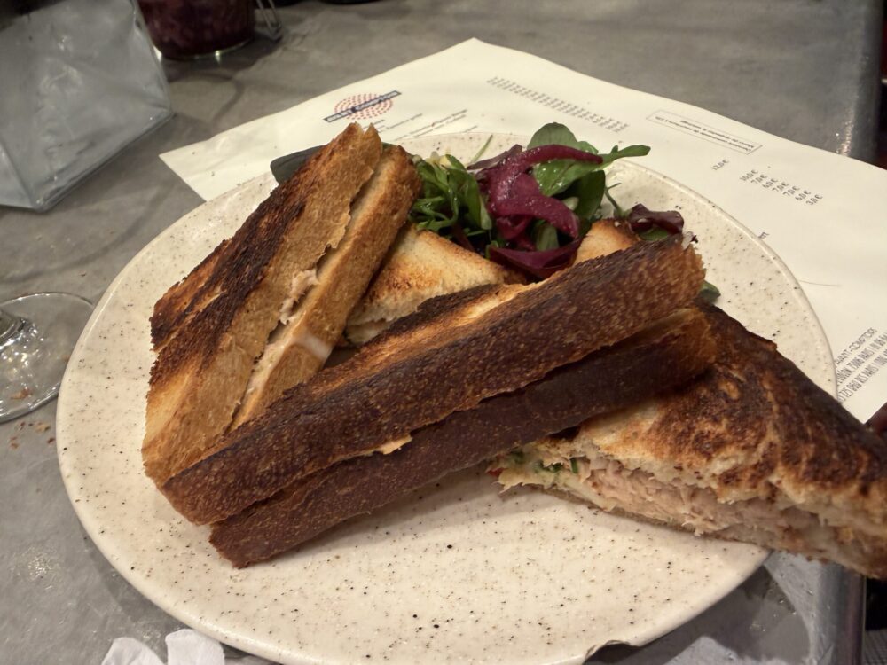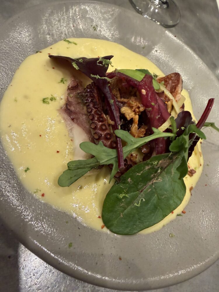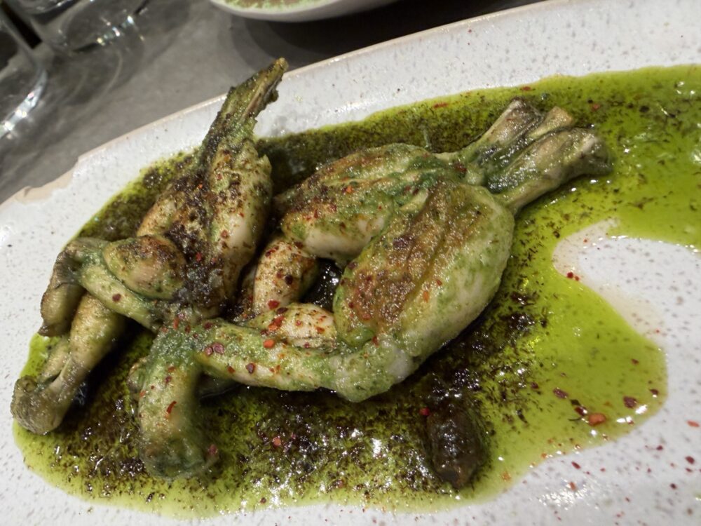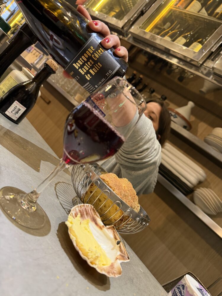 Una barra di metallo con sei sgabelli, un “muro” di vini perlopiù naturali e una scelta di piattini di grandissimo gusto. Ostriche e carpacci di pesce del giorno, Ravioli di gamberi e crostacei al pesto; tartare di trota con Kiwi e kalamansi, capesante con puree di barbabietola e cipolla rossa ovvero alle olive e cerfoglio, coscette di rana al burro e prezzemolo, polpo con mousse di mais e cipolla fritta, sandwich al tonno, crocchette di seppia, taramosalata di uova di merluzzo affumicate, una montagna di burro in bella vista da aggredire all’occorrenza.