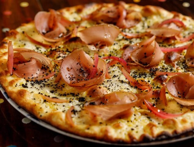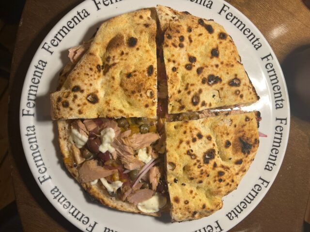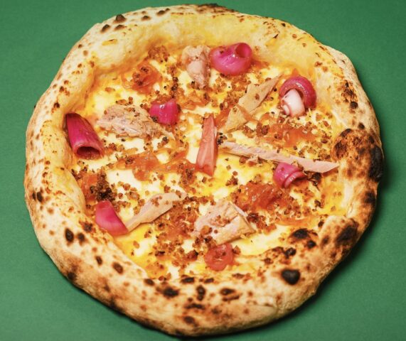 Tonno e Cipolla 2.0: fior di latte, cipolla rossa di Tropea, ricotta di bufala, filetto di tonno fresco affumicato.