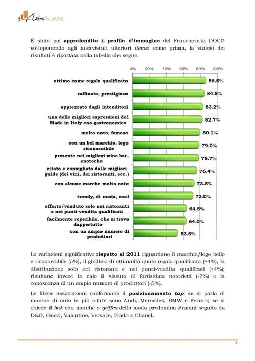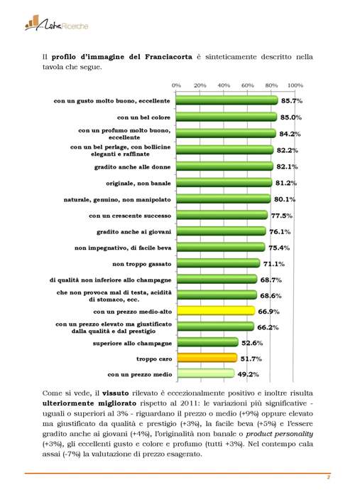 Dall’indagine emerge un generale rafforzamento del posizionamento di alto livello del Franciacorta, sia da un punto di vista strettamente enogastronomico (gusto, abbinamenti, eccellenza del prodotto) che da un punto di vista più valoriale, per cui Franciacorta è sinonimo di qualità e prestigio. Inoltre, quando Franciacorta è associato a brand di categoria merceologiche diverse, questi sono di alto profilo e con un ottimo standard qualitativo. I marchi citati, ad esempio Audi e Armani, possono essere ricondotti a prodotti di “lusso”.
