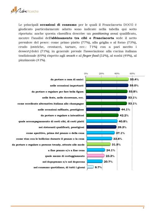 Per quanto riguarda le occasioni di consumo il Franciacorta si conferma un vino per le occasioni speciali, le ricorrenze, i regali e i festeggiamenti; a tavola è per lo più considerato un vino da abbinare ai piatti a base di pesce (76% con i primi; 73% con i secondi alla griglia o al forno).