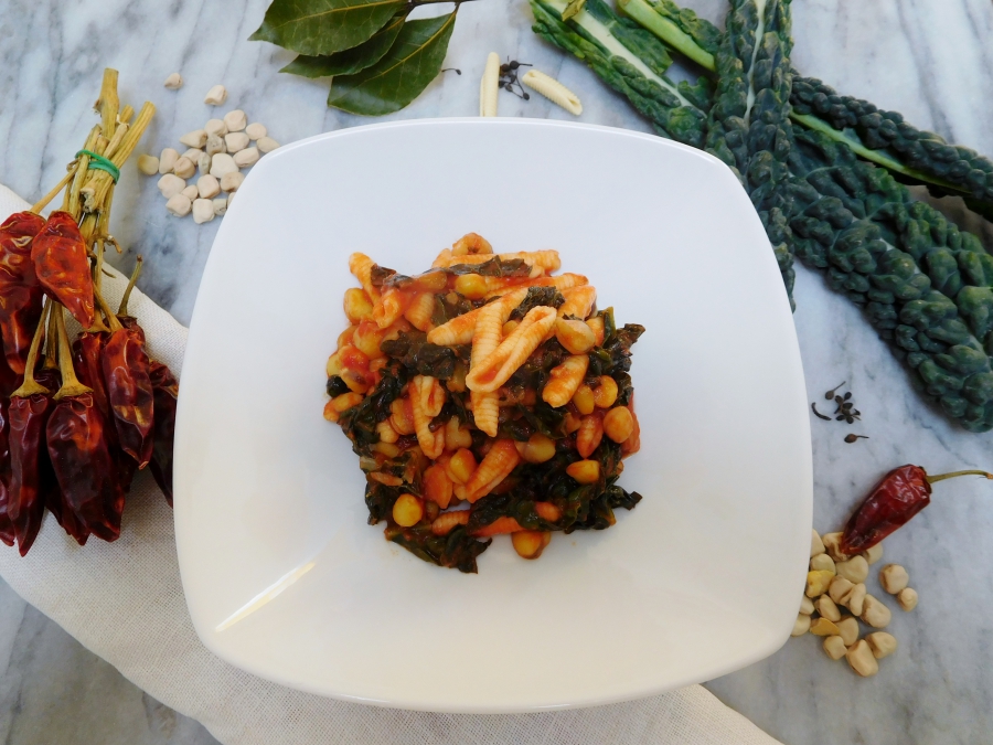 In un tegame largo mettere uno spicchio d'aglio intero e tre cucchiai di olio di oliva, lasciare scaldare a fuoco basso. Versare il cavolo nero e il peperoncino intero nel tegame con l'olio e l'aglio, salare. Dopo alcuni minuti aggiungere le cicerchie scolate e la salsa di pomodoro. Lasciare cuocere per una decina di minuti, se dovesse essere necessario allungare con dell'acqua di cottura delle cicerchie.
