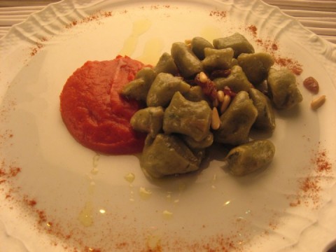 Bollirli e contemporaneamente in una casseruola scaldare smen/olio/acciughe e farle sfaldare delicatamente – e poi aggiungere le olive nere snocciolate, l’uva passa ammollata precedentemente in acqua e strizzata, i pinoli leggermente tostati.