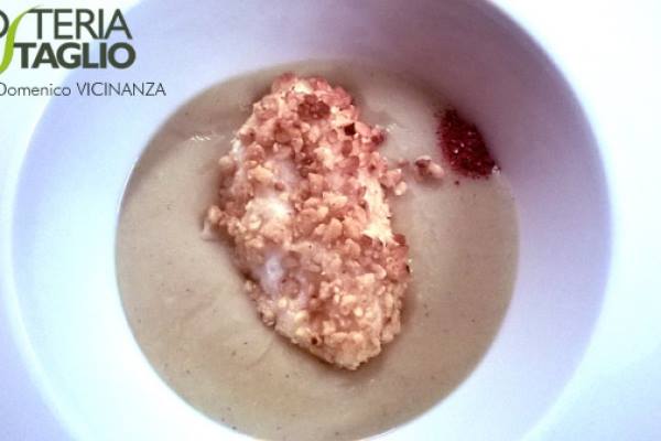 Gnocco di baccalà mantecato, su crema di cicerchie e polvere di peperone crusco