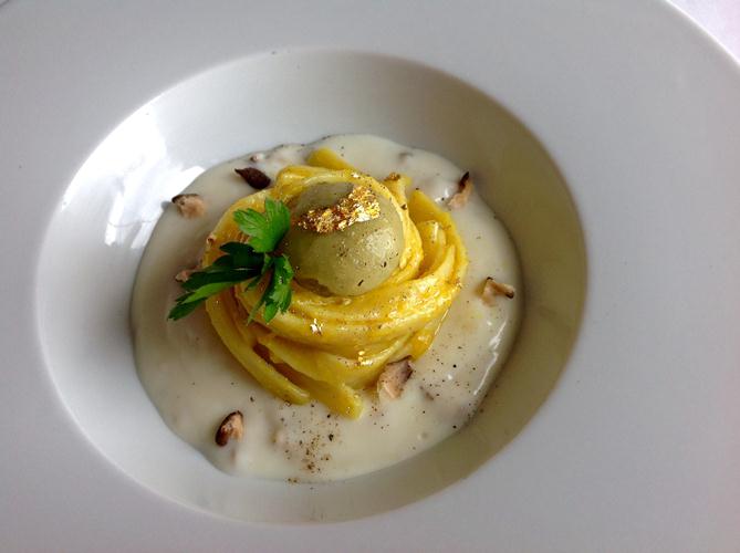 Disporre sul fondo del piatto un abbondante strato di crema di Bufala e Shitake, quindi un nido di fresine ed infine l’oliva sferificata. Irrorare con un filo d’olio alle nocciole. Completare con una spolverata d’oro, di pepe e parmigiano a piacere.